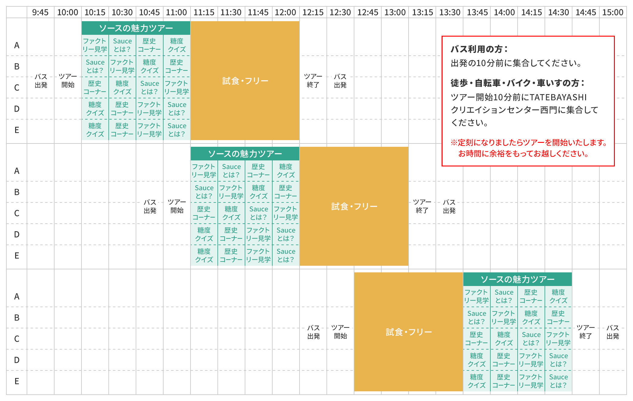 - バスの出発時間、ツアー開始時間の10分前に集合をお願いします。定刻を過ぎた場合はキャンセルとみなしますのでご注意ください。